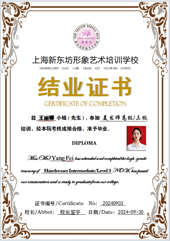 新东坊形象艺术培训学校结业证书