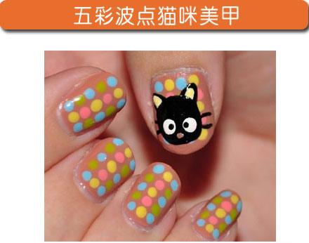 这款五彩波点黑色小猫咪的美甲,以肉红色为底色,搭配上粉,黄,蓝,绿四种颜色的小波点,现在指甲上画上四种小波点再在上面画上黑色的小猫,整款美甲造型十分活泼,就如同小猫咪般可爱。