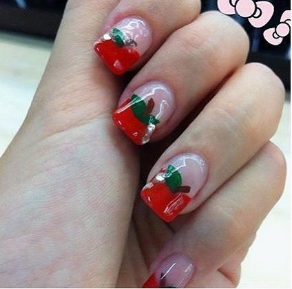 鲜红爽脆的苹果美甲 2012美甲图案精选,用水果妆点指甲。爽脆的红苹果谁不喜爱,而且常吃苹果还有益健康。光吃不够还要看,所以就把苹果画到了指甲上了。先画上一层莹亮的粉色指甲油作为底色,待它干透后开始把苹果画上去了。蘸取红色的指甲油在指甲的中部开始画出红色的法式美甲款,同样是要等待颜色干透;接下来就可以用绿色的指甲油添上苹果的叶子了,无论是一片还是两片都可以,只要你喜欢就好。最后就是要画“梗”了,轻轻地在叶子根部添上小小的一笔,苹果就已经画好了。觉得苹果不够闪亮?小编也有办法,就是使用透明的水钻,伪装成水滴的样子吧。挑选适合大小的水转,把它粘到苹果的一侧就可以了。上述的美甲彩绘,亲爱的姐妹们已经学会了吗?
