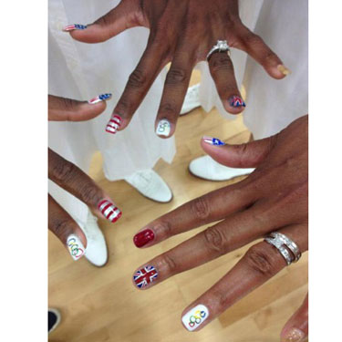 美国排球队的姑娘们上场前做了个美美的指甲,将奥运五环、美国国旗和英国国旗都运动到了美甲中。