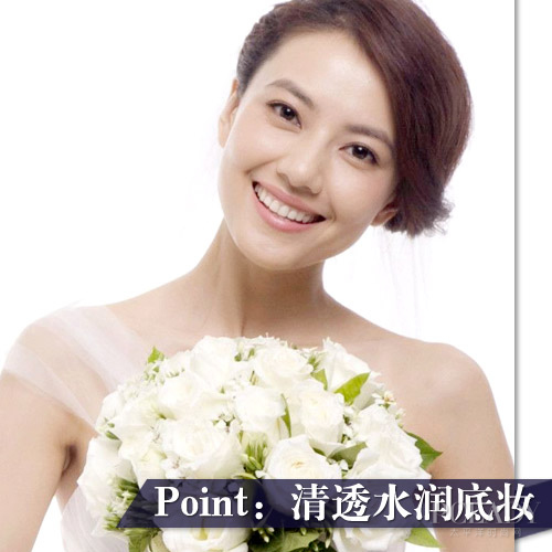 Point:清透水润底妆 妆容虽然看起来很清淡,却并不是未加修饰的纯自然肌肤。在用蜜粉打出粉嫩肤质的同时瞬间缩小脸颊,先用水分足够的粉底液在脸上打底,然后以粉扑蘸上适量蜜粉快速拍打全脸,直到蜜粉均匀散布在肌肤上为止。这样做仅仅几秒钟,你就会觉得双颊肌肤被向上提拉,整个脸部线条都纤秀起来。 Step 1: 挤出约一粒珍珠大小的粉底量,点于两颊、额头、鼻子、下巴,用指腹从脸中央往外均匀推开。 Step 2:使用大海绵再次将整脸的粉底,轻压一次让底妆更加地服贴,避免不均匀的情况产生。 Step 3:黑眼圈是最在意的瑕疵,使用眼部专用的遮瑕品来修饰眼周的暗沉,一定要越薄透越好。 Step 4: 最后,利用海绵将修饰后的瑕疵部份再次轻压,遮瑕品与底妆能更加地自然融合。