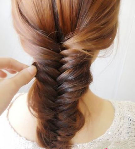 编到发尾,用皮筋将系上结,一条鱼骨辫算是完成了。