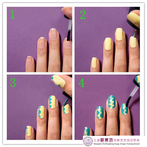 一成不变的美甲方式是不是让你感到乏味呢?来点不一样的吧!下面为大家分享一款个性DIY冰激凌美甲,有详细的教程哦,赶紧动手试试吧!步骤一:先给指甲涂抹一层底油,可以更好上色和保护指甲。步骤二:底油干透了后,再涂抹一层鹅黄色指甲油。步骤三:鹅黄色指甲油干透了后,再用蓝色指甲油画出几个不规则的半圆形,要连接在一起,另一边也按照同样的方式画。步骤四:指甲干透后,最后再涂抹一层亮甲油,这样这款美甲就完成了哦。